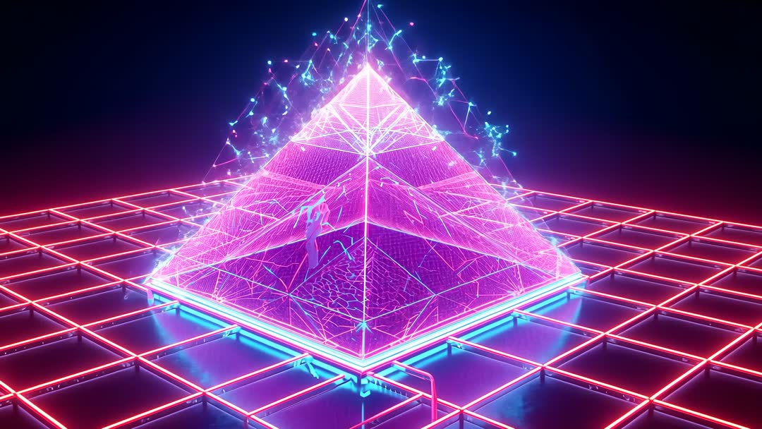 AI Generated Image. Looping neon pyramid animation charging and emitting cyan sparks above glowing grid while wireframe surfaces pulse with electric veins. Camera orbiting slowly with subtle zoom to emphasize apex and particle emission. Color palette focusing on magenta and cyan for retrofuturistic synthwave mood. Ideal for VJ loops, music video backgrounds, club visuals, live stage projections, streaming overlays, website headers, product promos, and tech presentation intros. Easily adaptable for branding by color grading or overlaying logo and text. Looping clip performing seamless transition for DJ sets, event visuals, social media reels, and animated banners. Delivering high-impact cyberpunk aesthetic with strong reflections and geometric symmetry to support futuristic narratives or tech-focused campaigns.
