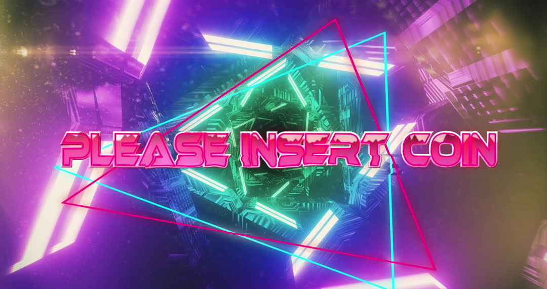 Colorful neon triangles form a mesmerizing animated digital tunnel with bright light trails. Central text reads 'Please Insert Coin', invoking a classic retro-inspired video game aesthetic. Suitable for use in tech or gaming event promotions, vintage 80s themed designs, and cyber-infused advertising campaigns.