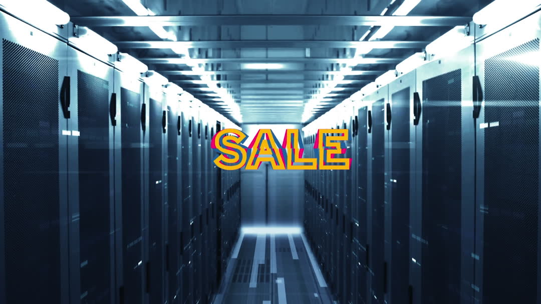 - Neon Sale Overlay in Futuristic Server Room with Digital Grid