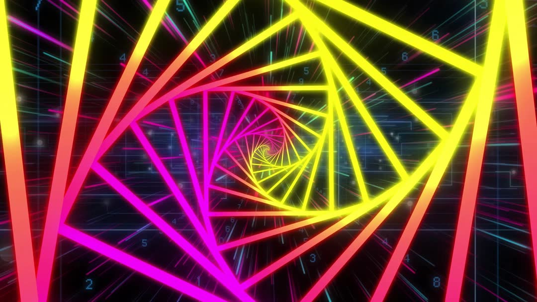 Video showing neon-colored square frames spiraling right into deep tunnel while glowing data grid and streaming numeric elements shift outward. Bright magenta-to-yellow gradient bars rotate inward, creating hypnotic vortex, motion streaks, and pulsing light trails. High-energy, futuristic mood with strong geometric rhythm and vivid color contrast. Ideal for looping backgrounds, music visualizers, electronic music event visuals, sci fi title sequences, motion design overlays, website hero banners, broadcast idents, VJ sets, and app or VR intros. Works well as transition clip, promotional background, or ambient backdrop for tech, gaming, and retro-futuristic campaigns.