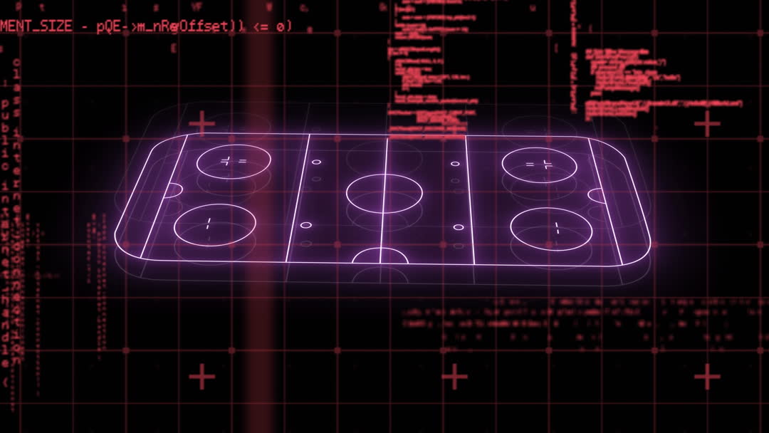 An animated depiction of a sports field outlined in neon pink, overlaid with digital data elements in various red hues on a dark background, creates the vision of advanced technology integration in sports analytics. Suitable for illustrating concepts in sports technology, futuristic sports solutions, or expanding on digital transformation narratives within tech solutions in sporting contexts.
