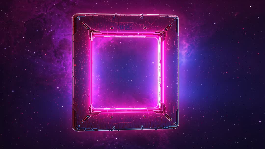 AI Generated Image. 10-30 second loop showing neon square frame rotating and pulsing inside purple nebula, emitting sparks and drifting stars. Perfect for sci-fi intros, VJ loops, music video backgrounds, streaming overlays, app loading screens, tech product promos, cinematic title cards, game trailers. Enhances branding with futuristic, cyberpunk, vaporwave mood while showcasing AI generated neon effect for modern digital design. Works well with electronic soundtrack, motion blur, and color grading for stronger cinematic feel. Compatible with 4K timelines and seamless looping workflows. Usage tips: adjust glow intensity and hue to match project palette; add particle layers for denser starfield; crop for vertical or square social clips; combine with typography or logo reveal for title sequence.