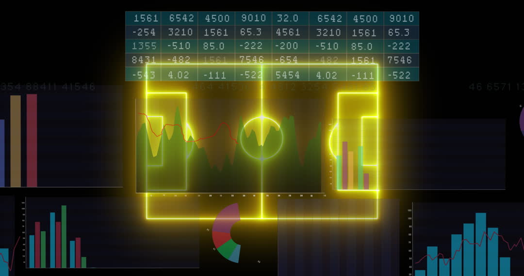 Neon stadium illustration intertwines with digital data graphics on black backdrop, suggesting synergy between global sports and technology. Usable for sports analytics presentations, futuristic application demos, digital interface promotions, or data visualization content illustrating sport-related analytics.