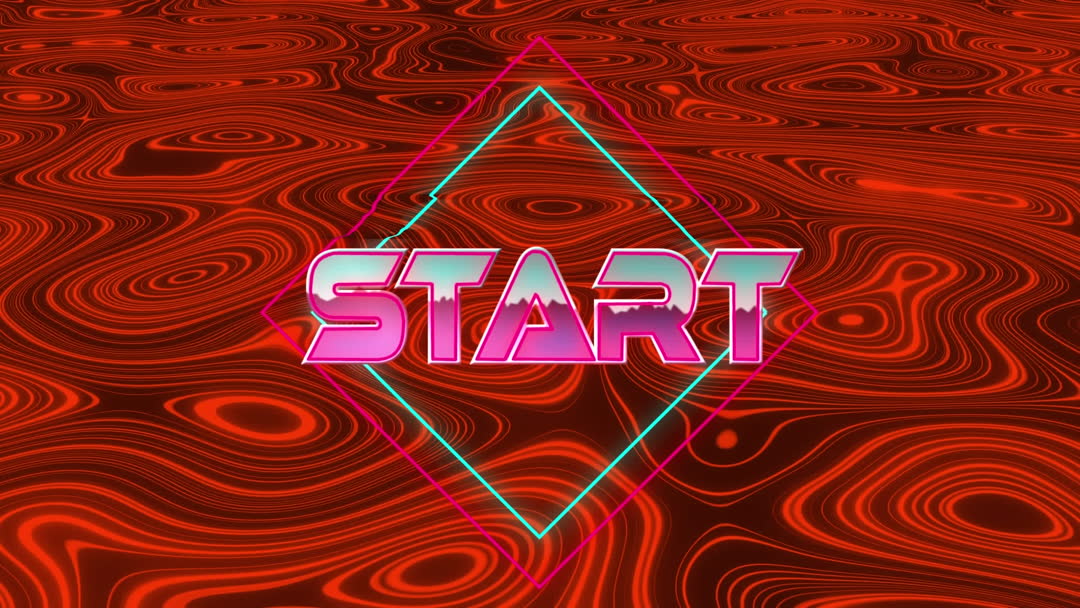 The design showcases a strikingly vibrant start button text in pink neon, overlaying dynamic colored geometric patterns. The background offers a red, lava-like appearance, reminiscent of retro video game aesthetics. This immersive visual could be utilized for creative web design, futuristic gaming interfaces, promotions, or vibrant event invitations.