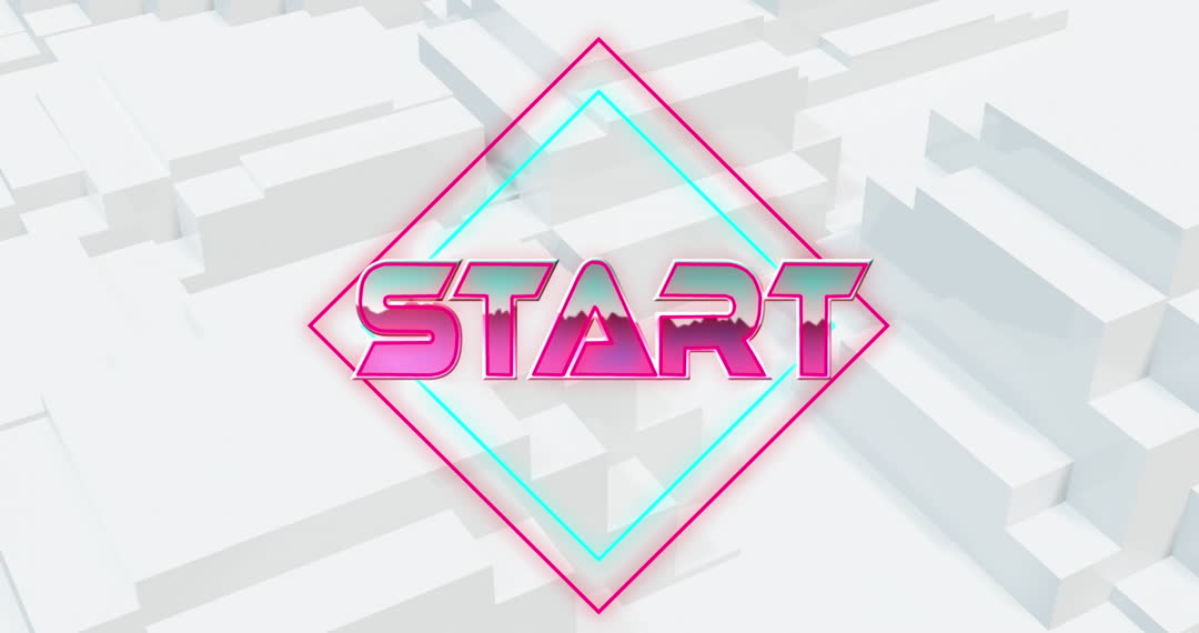 Colorful neon graphic with 'START' text set against a futuristic, geometric 3D background. Ideal for technology and digital-themed projects, showcasing innovations in visual design or as an eye-catching element in video game interfaces. Perfect for backgrounds in digital presentations, websites, or media where a pop of retro-futuristic style is needed.