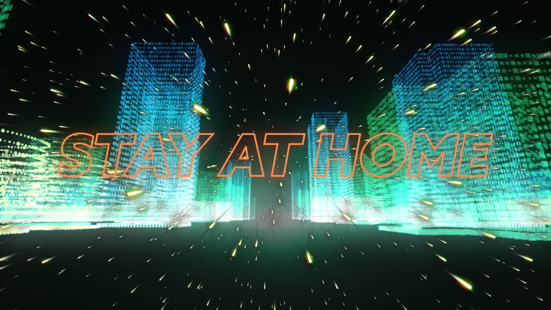 - Neon Stay At Home Message Over Futuristic City Skyline