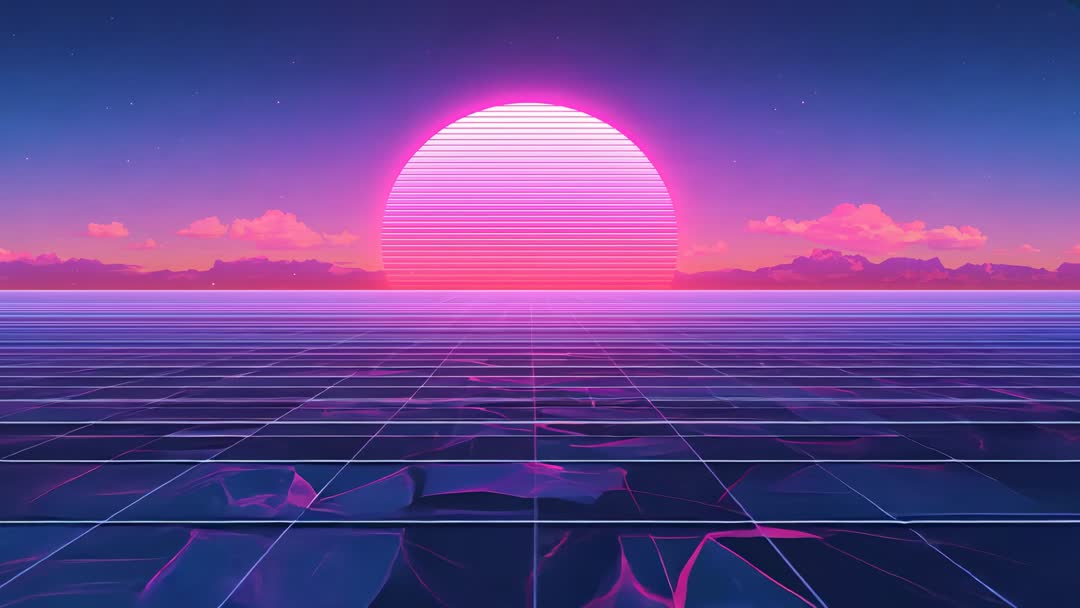 AI Generated Image. Showcasing neon sun rising over retro grid while horizontal scanlines pulse at horizon and mesh surface ripples across reflective plane. Featuring vibrant magenta, hot pink, indigo gradients with subtle starfield and distant mountain silhouettes. Evoking 1980s synthwave and retrofuturism mood for nostalgic yet futuristic storytelling. Serving music video backgrounds, powering electronic album cover animations, anchoring website hero loops, fueling social media ad clips, driving VJ visuals for live events, opening tech conference intros, and promoting retro gaming launches. Suitable for looping video backgrounds, animated headers, poster motion designs, and promotional clips requiring bold neon palette and rhythmic motion. Allowing easy color grading and overlay text placement for branding and call-to-action graphics.