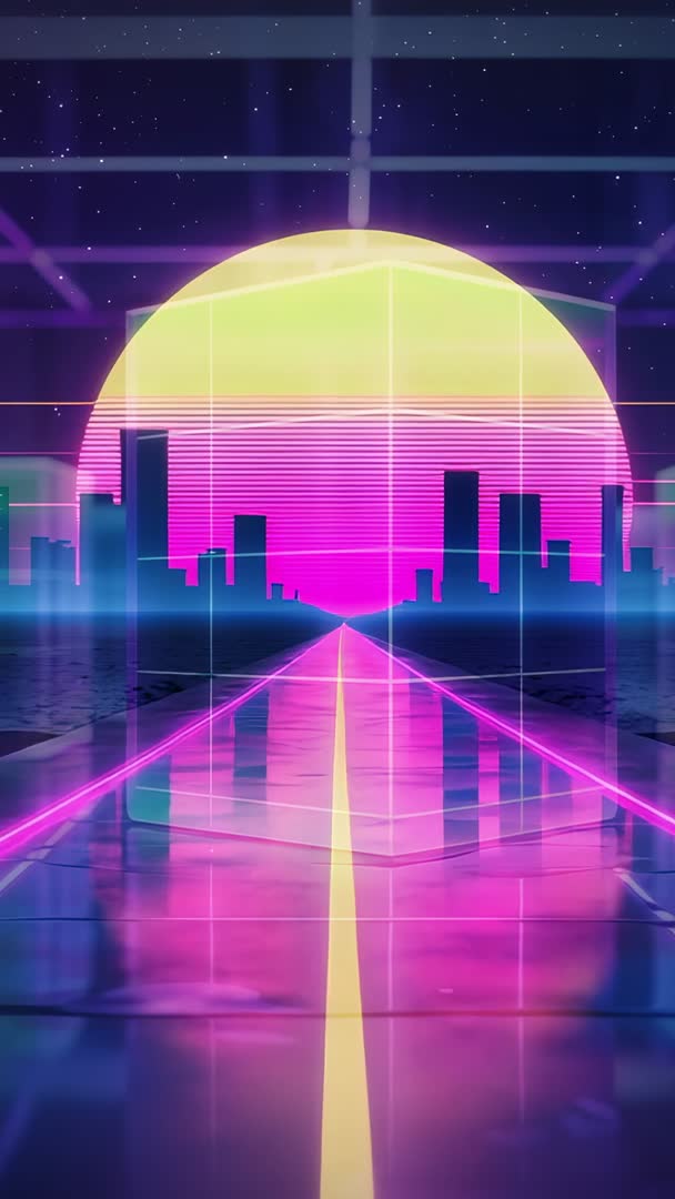 AI Generated Image. Showing neon synthwave highway stretching toward oversized pulsing sun with horizontal scanlines and glowing grid reflections on glossy surface. Featuring silhouetted cyber city skyline framing horizon and starry sky with subtle chromatic glow. Blending magenta, purple, cyan, yellow for high contrast retrofuturistic look. Vertical composition optimized for mobile viewing and social platforms. Working well for music visualizers, DJ intros, streaming overlays, app splash screens, TikTok reels, Instagram Stories, event promos, retro gaming trailers, tech product launches, YouTube channel backgrounds. Compatible with seamless loop playback and color grade adjustments. Providing immersive neon atmosphere for branding, motion graphics, title sequences, VJ sets, and background for promotional videos.