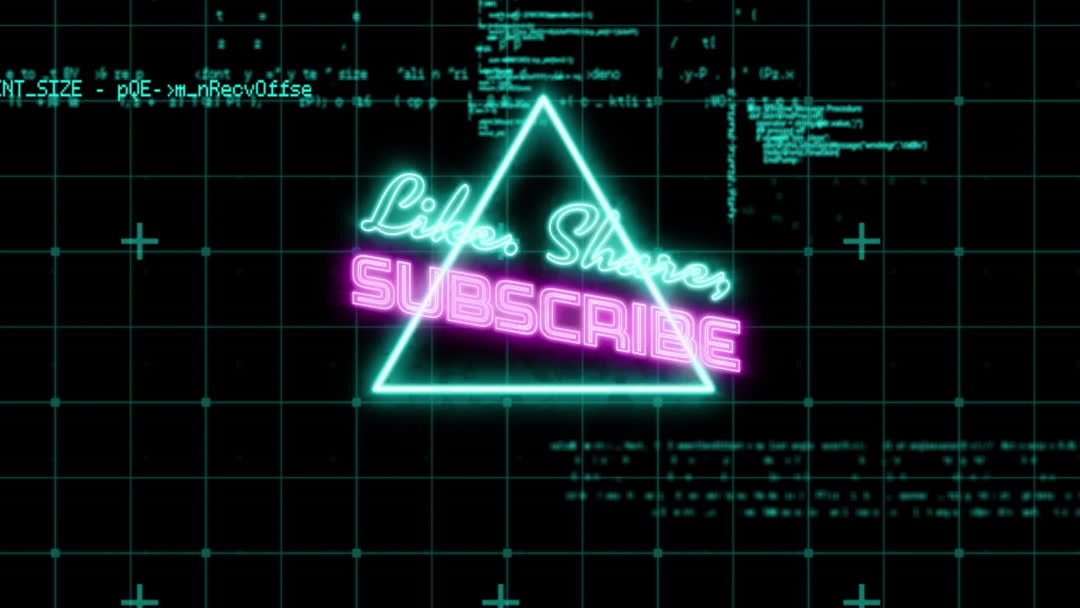 Digital art combining glowing neon text 'Like, Share, Subscribe' with data code aesthetic. Perfect for online creators looking to enhance viewer engagement or as an intro/end slate in videos.highlight urban, tech-inspired theme suitable for any online platform
