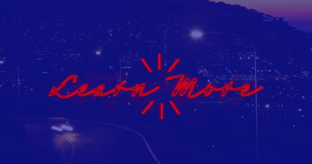 Glowing neon text saying 'Learn More' set against an aerial cityscape at night with visible traffic creates an engaging and modern visual. This can be useful for business presentations, social media design, website headers,and advertisements highlighting the theme of navigation, technology, and learning initiatives.