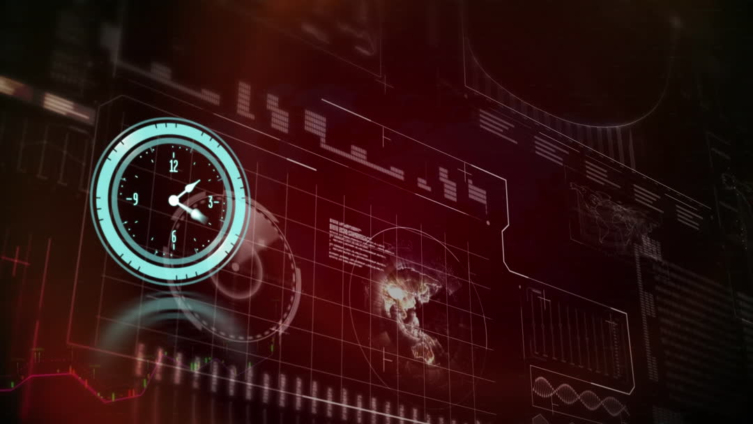 Futuristic digital clock overlay on a red IT security interface, showcasing time linked with tech elements. Useful for illustrating technology in modern business, online data surveillance, and cyber timelines.