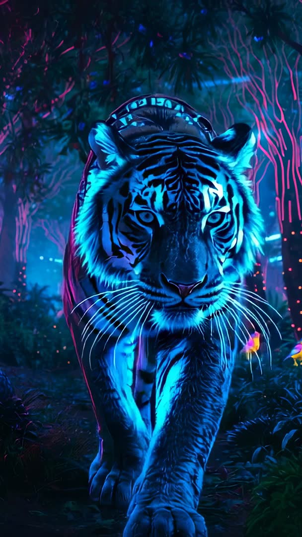 AI Generated Image. Vertical video showing tiger walking toward camera through bioluminescent, neon-lit forest while wearing glowing harness and accompanied by fluttering glowing bird. Close-up, low-angle framing emphasizing intense eyes, detailed whiskers, and powerful stride. Lighting dominated by cyan and magenta tones with subtle particle sparks and luminescent flora creating cinematic, mysterious, futuristic mood. Useful for social media vertical ads, Instagram Reels, TikTok clips, mobile wallpapers, film intros, sci-fi trailers, music videos, game trailers, club visuals, and stylized conservation campaigns. Suggested edits include slow-motion reveal, loopable trim for backgrounds, parallax title layers, ambient synth soundscape, and boost of cyan-magenta contrast in color grade. Leave safe zones at top and bottom for captions and logos and consider adding subtle particle or lens flare overlays to enhance neon atmosphere.
