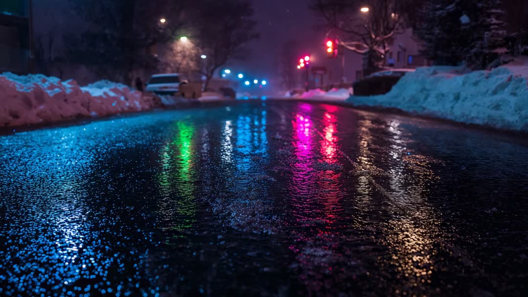- Neon traffic light reflections shimmering across icy wet street in quiet snowy night