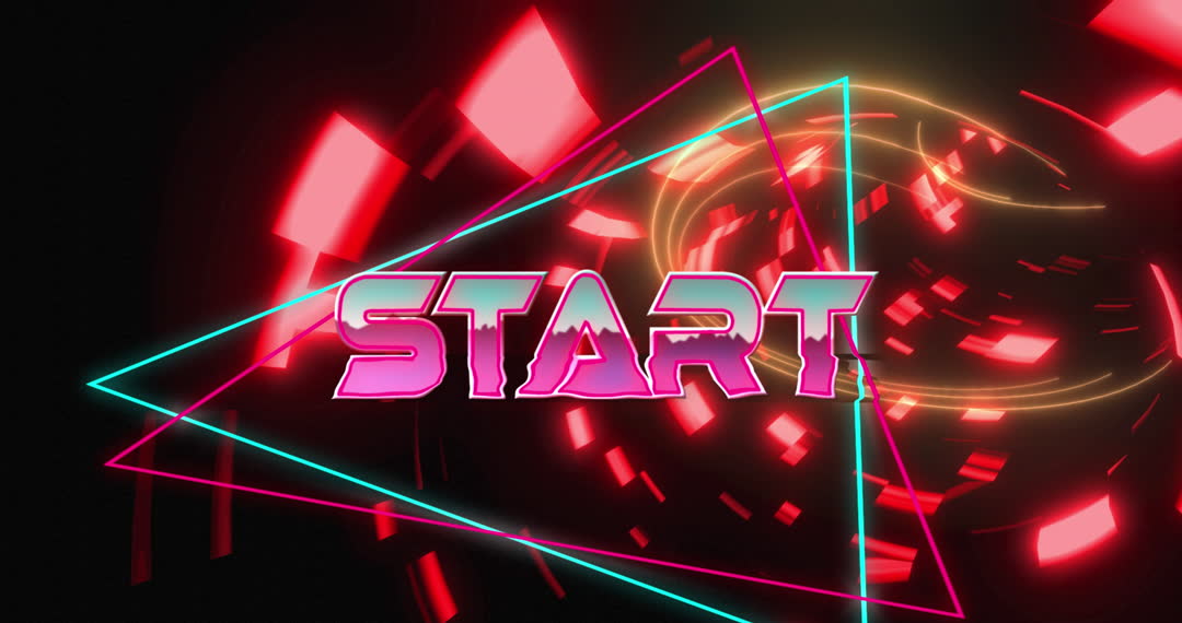 Animation featuring vibrant neon triangles and dynamic light patterns radiating outwards, with prominent text reading 'START'. Ideal for use in gaming intro screens, digital communication themes, and motion graphics projects illustrating speed and energy.
