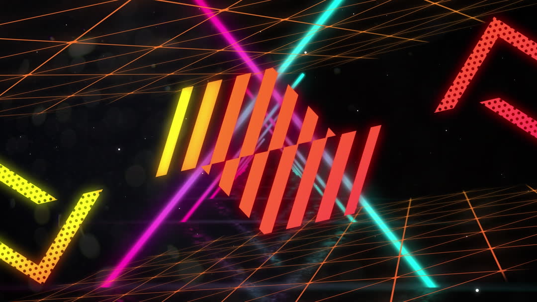 Vibrant animation featuring neon triangular shapes combined with geometric elements on dark background. Suitable for technology themes, modern digital presentations, and futuristic design projects, enhancing any platform calling for creative visual interest.