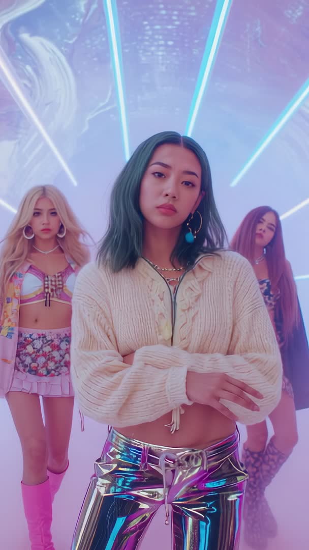 AI Generated Image. Vertical music clip featuring three performers moving through neon-lit tunnel with mist and angled laser beams. Lead performer standing center with crossed-arms pose and direct gaze while backup dancers framing background and executing synchronized hip sways. Visual palette using pastel purples, cyan, magenta, and reflective metallic fabrics creating retro-futuristic club vibe. Rhythm-driven editing opportunities with strong beat hits matching laser pulses and camera moves. Use for music promo, fashion campaign, social media reels, nightclub event promo, dance school showcase, and editorial video opens. Edit-friendly composition offering close-up center framing, medium group shots, and wide shots of light architecture for rhythmic cuts and transitions. Pair with upbeat pop, electronic, synth, or K-pop influenced tracks for maximum impact. Suggested captions: "Leading neon choreography", "Club-ready confidence", "Futuristic group energy". Licensing-friendly background and stylized lighting simplifying masking, overlays, and color grading for branded content and motion graphics.