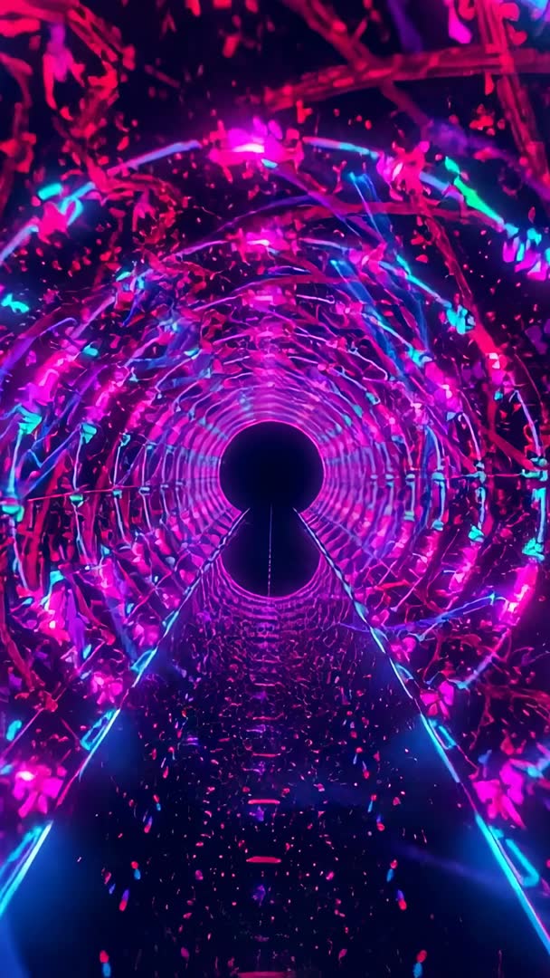 AI Generated Image. Vibrant vertical video showing neon-lit tunnel advancing toward central black circle while confetti strands and particle ribbons swirl. Suiting vertical social media use such as Instagram Reels, TikTok, Snapchat stories, mobile ads and short-form promos. Working as dynamic background for music videos, DJ visuals, event promos, tech product launches, cryptocurrency or blockchain-themed content. Pairing with heavy electronic soundscapes, synthwave tracks, cinematic transitions or upbeat pop mixes to amplify energy. Delivering immersive, loopable clip for motion design, VJ loops, streaming overlays, or website hero backgrounds. Featuring electric pink and cyan palette, strong symmetry, reflective floor, deep perspective and dynamic particle motion for high-impact visuals. Editing suggestions: speed ramping, color grading, overlaying text or logo on central black circle, adding subtle camera shake or glow for increased intensity.