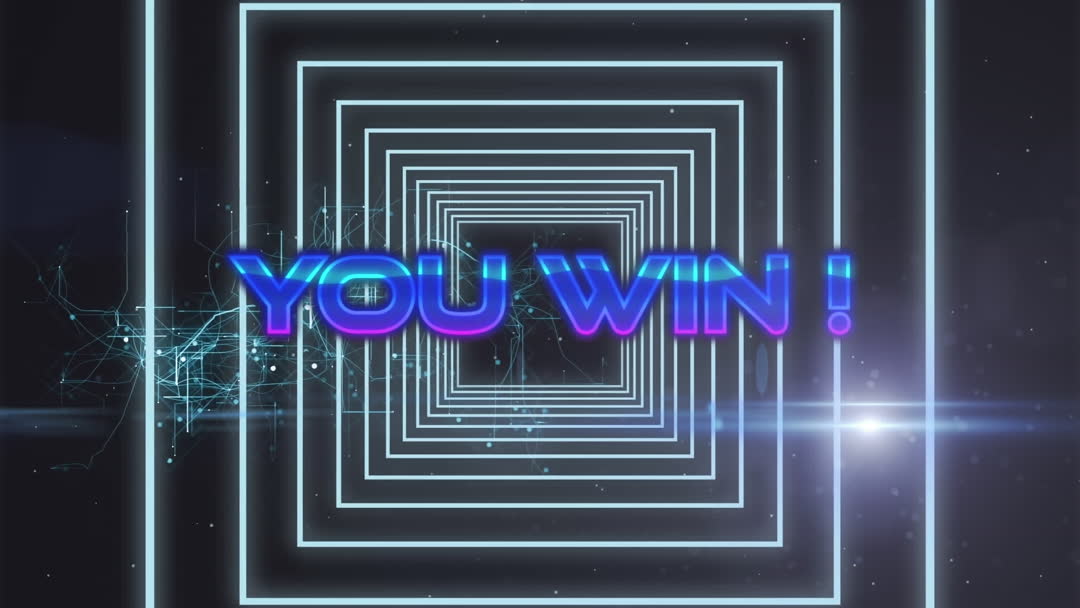 Neon text glowing prominently within geometric tunnel captures essence of victory moment familiar to video game players. Square neon frames enhance futuristic and cyber theme, celebrating success and achievement digitally. Ideal for use in gaming platforms, digital banners, or event invitations evidencing triumphant gameplay results.
