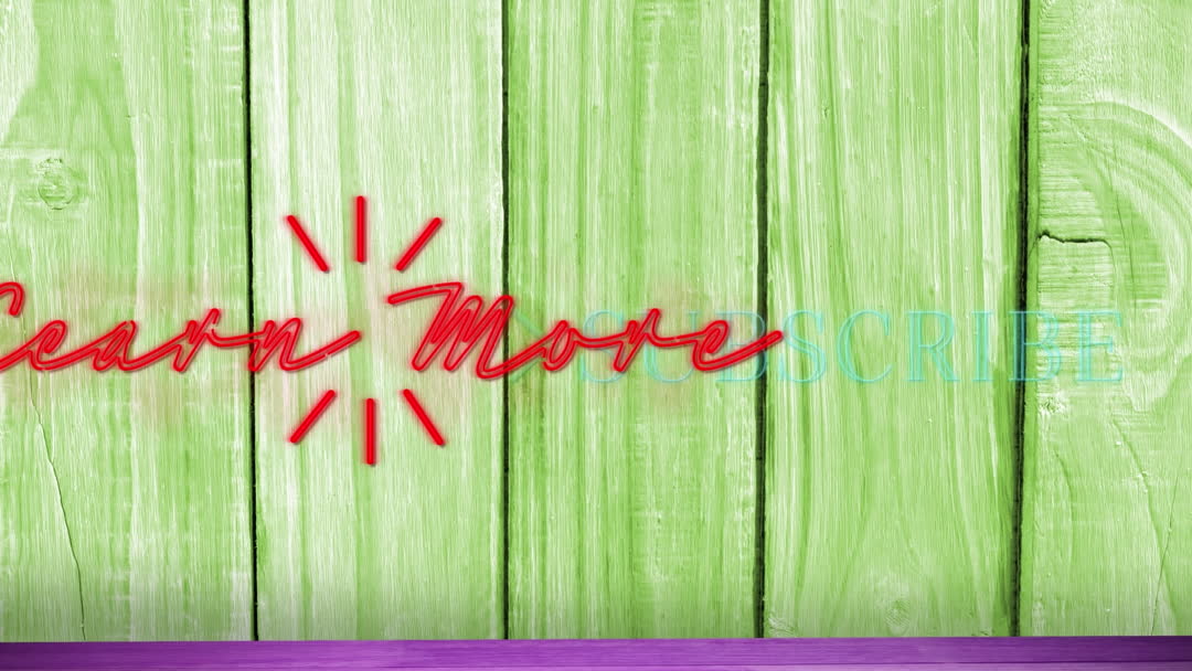 Vibrant design featuring neon typography overlaying a lively wooden background. 'Learn More' and 'Subscribe' texts create an engaging digital interface concept. Perfect for social media graphics, website banners, or digital marketing materials seeking to captivate interest through bright and playful visuals.