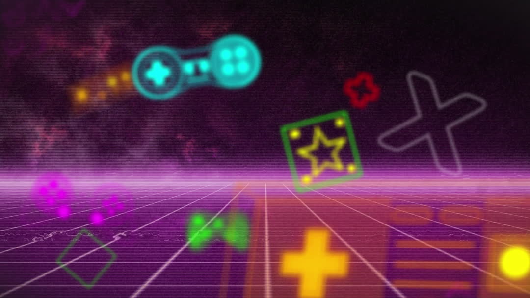 Neon Video Game Controller Icons Over Purple Digital Grid Video