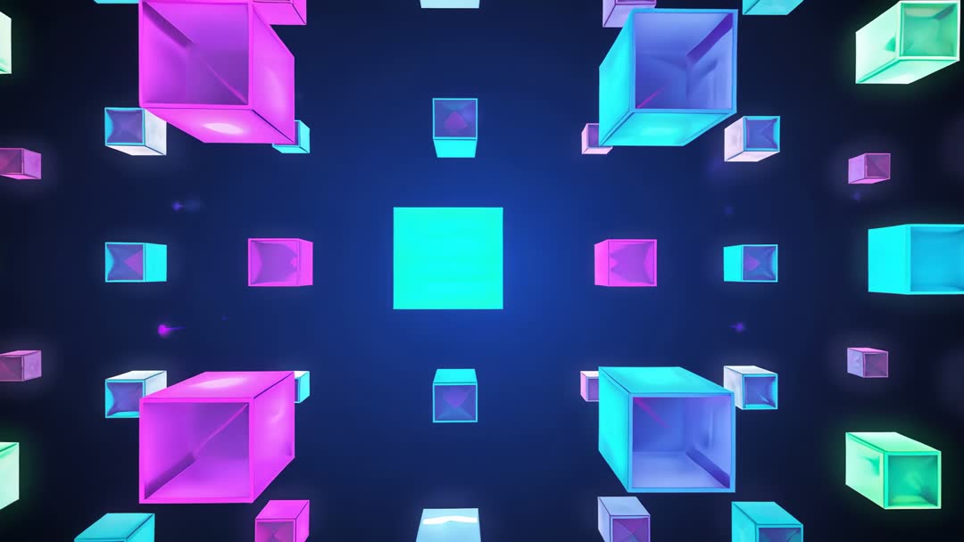 AI Generated Image. Video showing camera moving forward through neon voxel tunnel with floating glowing cubes converging on central cyan square. Visual featuring strong perspective, symmetry, grid layout, and vibrant cyan-magenta palette against deep navy background. Elements glowing and pulsing, cubes rotating slowly, depth of field adding cinematic atmosphere. Use for tech intros, electronic music visuals, sci-fi trailers, motion graphics backgrounds, broadcast bumpers, website hero loops, and social media clips. Workflows including trimming to create seamless loop, placing logo reveal over central cyan square, applying color grading to match brand palette, and syncing cuts to audio beats for dynamic edits. Deliverables ready for 4K and 60fps projects, suitable for VR previews, UI placeholders, promo reels, and background plates.