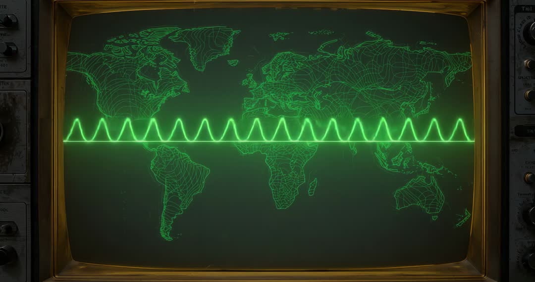 AI Generated Image. The video shows a neon waveform oscillating across a wireframe world map displayed on a classic CRT screen, illustrating themes of synchronization, data transmission, and technology tracing. The retro look evokes vintage technological nostalgia, which may suit projects on data transmission, global communication, cyber networks, and electronic science exhibitions. Ideal for educational videos in digital communications, circuit design innovations, retro tech revivals, or adding a tech-driven storytelling vibe with a dash of vintage futurism.