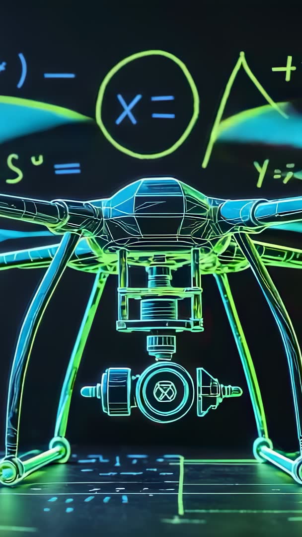 AI Generated Image. Futuristic neon wireframe quadcopter powering up rotors and descending over glowing grid floor in vertical video clip. Holographic blueprint elements and floating mathematical symbols providing tech and STEM context for robotics and UAV engineering. Using for tech product promo, startup pitch, mobile app intro, social media Reel or Story, tutorial on drone mechanics, trade show display, or sci-fi motion graphics sequence. Clip suiting vertical formats and mobile-first platforms, enabling looped background, title overlay, or split-screen comparison. Recommending pairing with synthwave soundtrack, high-contrast color grade, and animated lower thirds for maximum impact.