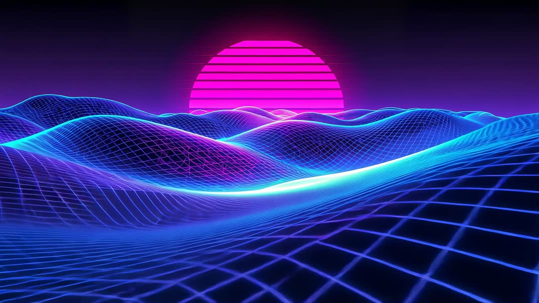 AI Generated Image. Looping neon grid video clip featuring wireframe terrain moving forward across virtual plain toward magenta-striped sun. Vibrant purple and blue gradient lines creating glowing wave patterns and deep horizon contrast. Retro-futuristic synthwave vibe making content feel nostalgic and futuristic simultaneously. Serving as background for music visuals, electronic music live sets, DJ loops, streaming overlays, podcast cover animations, tech product promos, app intros, website hero banners, social media reels, and motion design projects. Allowing easy color grading, speed adjustment, and seamless looping for flexible editing. Delivering high-resolution output suited for 4K displays and projection mapping. Licensing ready for commercial campaigns, brand videos, event visuals, and promotional trailers.