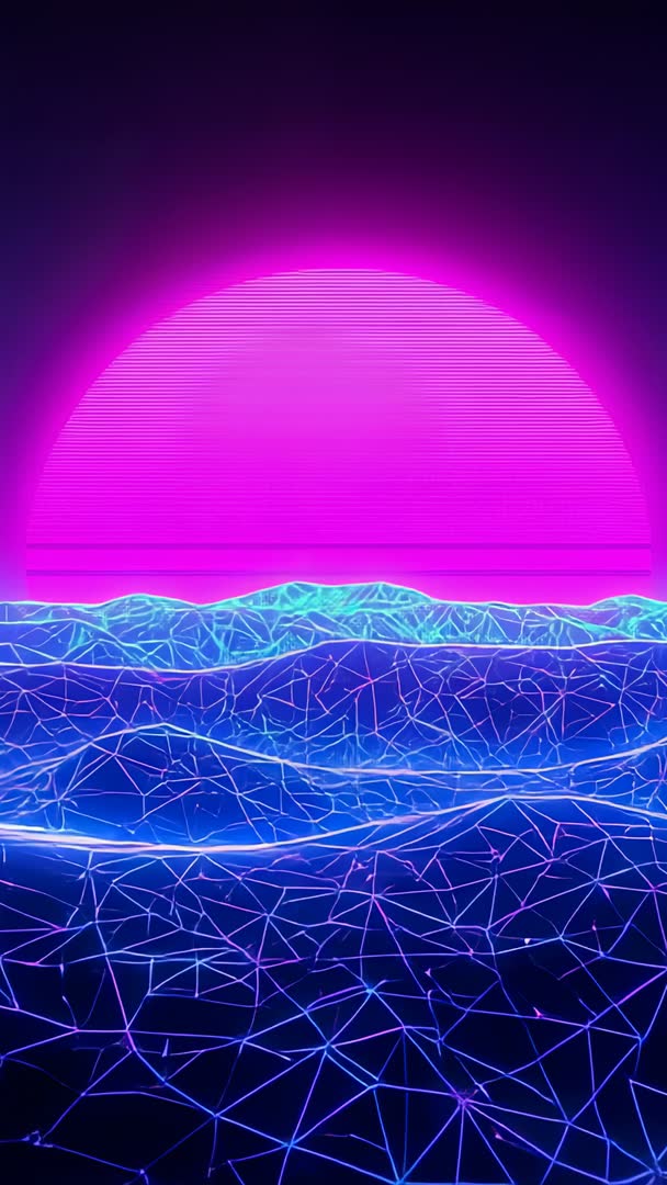 AI Generated Image. Video showing neon wireframe waves undulating across virtual grid while magenta sun glitching on horizon. Bright magenta and electric blue palette creating retrofuturistic synthwave mood. Motion loop catering to vertical 9:16 playback, offering seamless repeat for social stories and short-form platforms. Including music visualizers, DJ event visuals, app intros, tech presentation backgrounds, promotional reels, brand social ads, electronic music covers. Motion featuring subtle glitch artifacts and pulsing glow, delivering dynamic energy and immersive cyber atmosphere. File adapting well to overlaid text, logos, and color grading for custom branding.