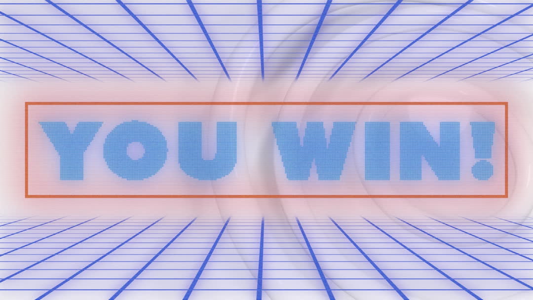 Neon 'YOU WIN' text displayed over a dynamic digital grid background, creating a retro-futuristic gaming atmosphere. Perfect for online game graphics, victory animations, motivational graphics, digital signage, or technology-themed projects.