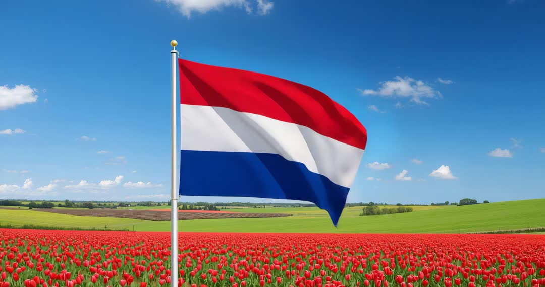 - Netherlands Flag Waving Over Tulip Fields with Countryside
