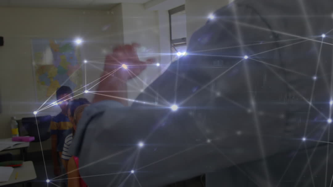 Network effect shows digital connections across a classroom setting, illustrating modern learning approaches and integration of technology in education. Useful for presentations on educational technology, articles discussing innovative teaching methods, or promotional content for smart classroom solutions.