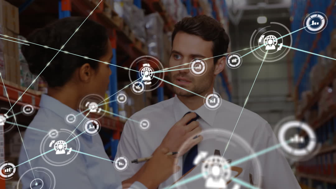 Diverse professionals communicatin in an industrial warehouse with overlay of connected network icons signaling communication, connectivity, and integration. Useful for illustrating logistics, modern technology in warehousing, supply chain management, and team collaboration.