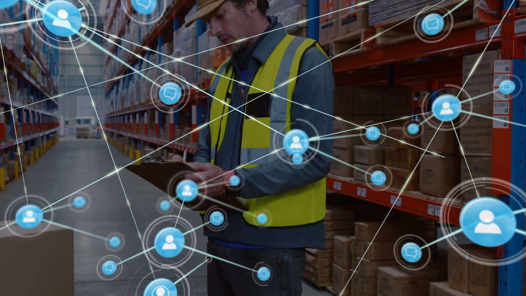 Depicting a man in a high-visibility vest inspecting a clipboard in a warehouse, this video shows superimposed digital icons and lines that represent network connections and global logistics systems. The blend of physical and digital elements emphasizes technological advancements in inventory management and supply chains. Useful for articles or presentations about modern logistics, shipping innovations, or the future of warehouse management.