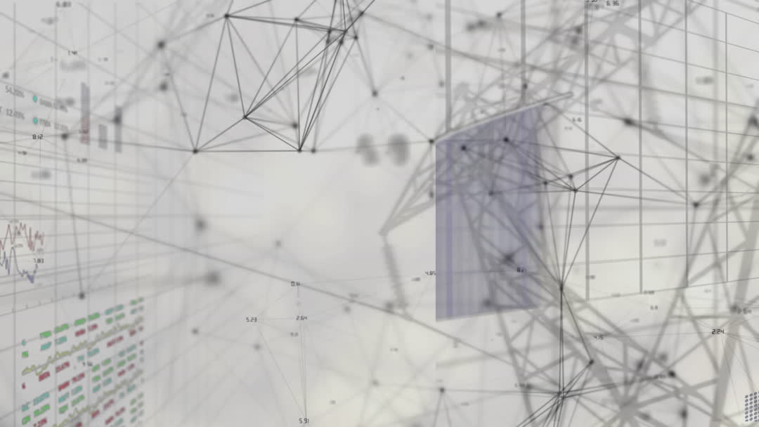 Abstract structure of lines and nodes with blurred data panels in background represents interconnected global systems or technological networks. Suitable for illustrating concepts like digital communication, global networking, big data, and data analytics discussions. Ideal for use in technology-oriented materials, presentations, or business strategy documents.