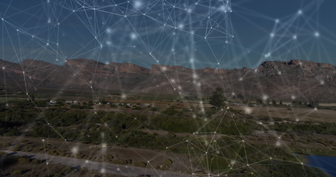 Overlay of digital network connections over a scenic landscape, visualizing global communication and data processing. Ideal for concepts around digital transformation, global finance, or technology-driven business environments. Useful for presentations, articles on connectivity, or advertisements in financial technology sectors.