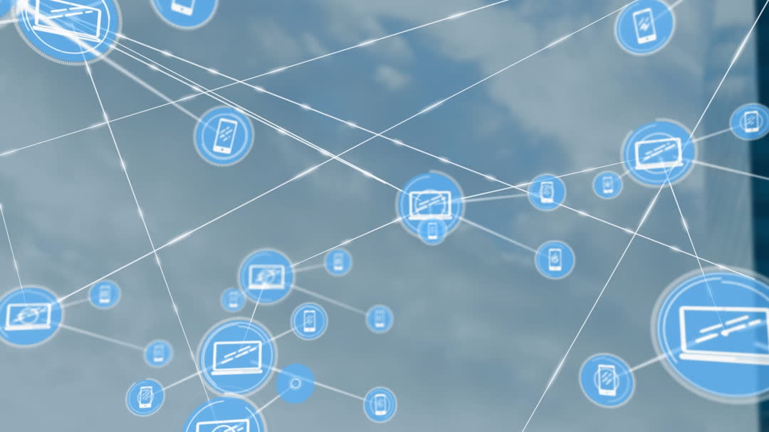 Abstract network animation showing interconnected icons of smartphones and laptops over blurred city background. Suitable for concepts of technology, digital communication, and global networking. Perfect for use in business presentations, technology conferences, and educational materials on data processing systems.