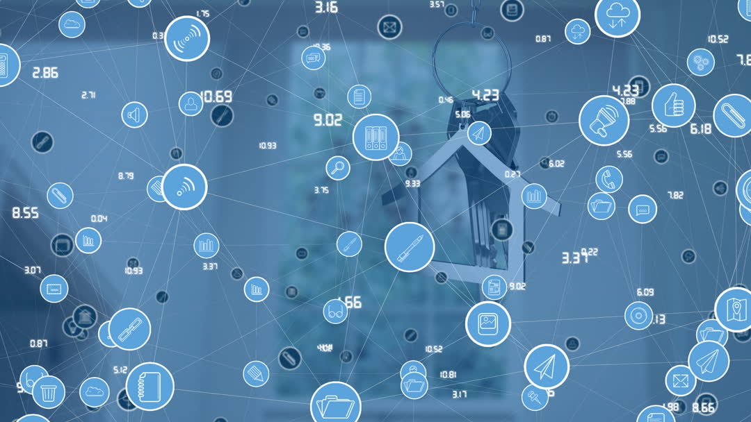 - Network Connections with House Key in Background Symbolizing Real Estate and Technology