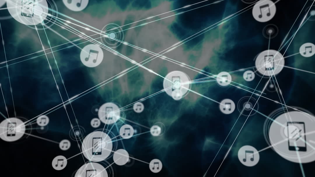 This video features a digital representation of a network with interconnected icons including music notes and cloud symbols on a dark background, suggesting digital connectivity and data exchange. Useful for illustrating concepts in cloud computing, digital streaming, data networks, and online communication platforms in technology articles and presentations.