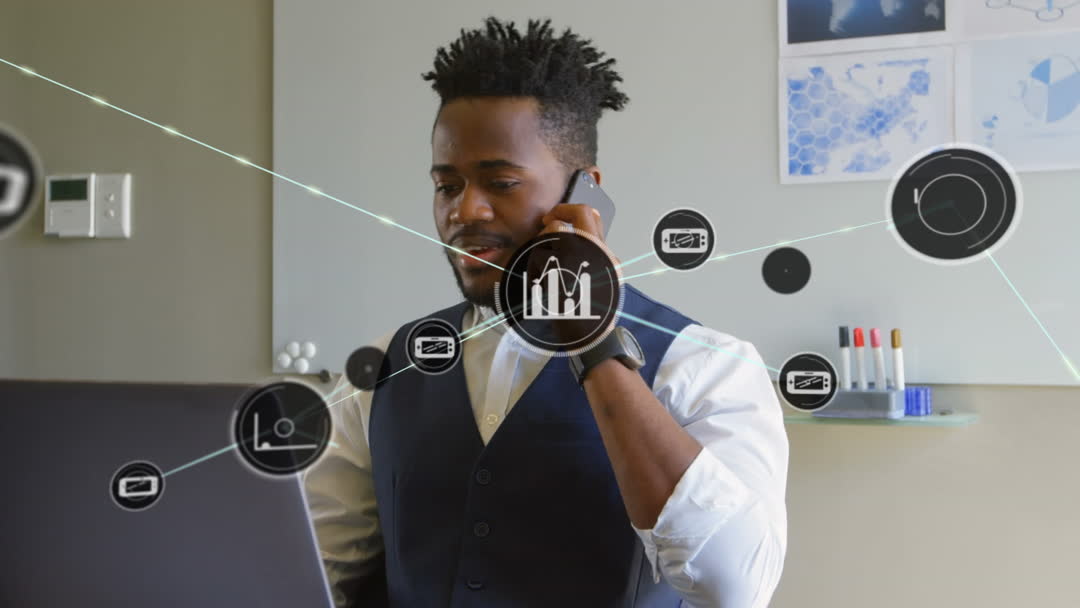 A young African American businessman multitasking on phone and laptop in an office, with digital network icons illustrating virtual connections in the background. This representation is ideal for highlighting digital marketing, telecommunications, remote work, and business connectivity. Suitable for illustrating concepts of global business network and modern, technology-enhanced communication systems.