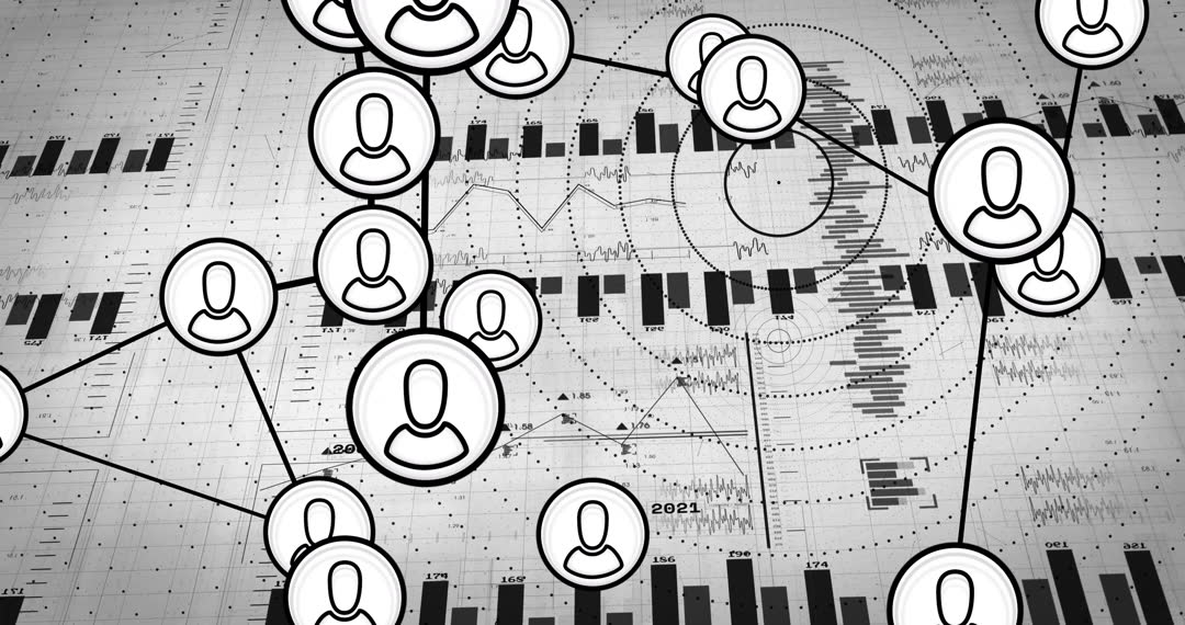 Abstract representation of user connectivity and data visualization in finance sector. User icons interconnected over dynamic financial charts indicate the convergence of big data and user interfaces. Useful for illustrating concepts of modern analytics, wealth management solutions, and technologically-inclined economic reports. Appropriate for promoting fintech, digital finance technology, or online analytics applications.