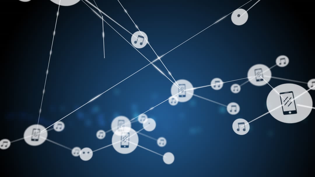 Visualizing interconnected smartphone and music icons over a blue digital background, representing communication and data sharing in digital networks. Suitable for use in technology blogs, presentations, social media banners, or advertisements related to media, networking, or mobile communication.
