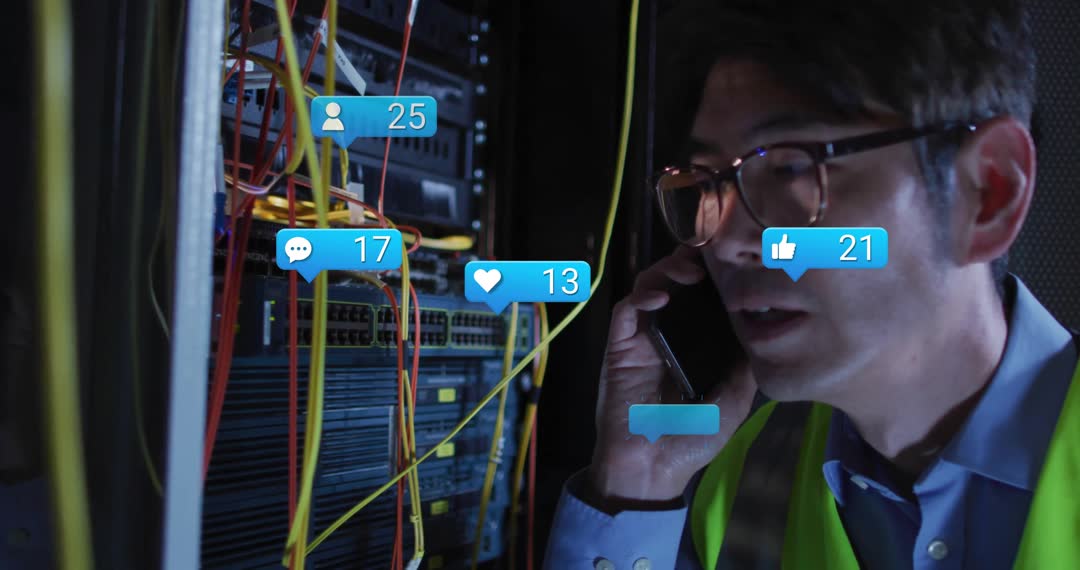 Professional technician engaged telecommunications system surrounded by network cables makes urgent phone call. Floating social media icons illustrate integration of social feedback with operations, blending digital communication and technological management. Useful tech presentations on cybersecurity, modern business infrastructure, or Enterprise networking concepts demonstrating intersection technology and real-time data interaction.