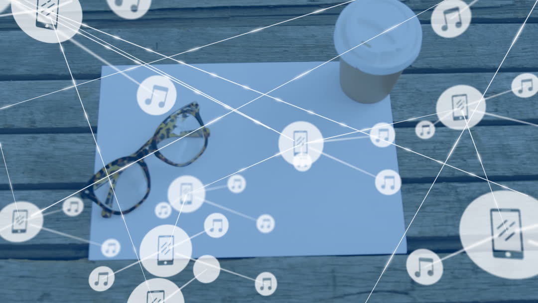 Dynamic visualization illustrates networking and communication with superimposed digital icons over paper and glasses on a wooden surface. The overlay of connection lines and icons like music notes emphasizes modern technology and global interaction. Effective for promoting digital innovation, educational materials about communication technologies, or network design concepts.