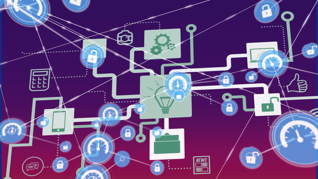 This video portrays an abstract representation of digital networking and connectivity, featuring floating icons such as locks, gears, and devices on a vibrant purple background. It symbolizes the interconnectedness of modern communication and technology. Ideal for use in projects related to network security, digital infrastructure, technological advancements, or company presentations focused on innovation.