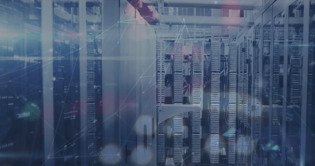 Depiction of digital connections over servers in a data center setting, demonstrating networking and technological integration. Useful for illustrating concepts such as data management, IT infrastructure, advancements in communication technology, and cloud computing solutions. Often employed in tech articles, presentations, or marketing materials to highlight modern connectivity solutions.