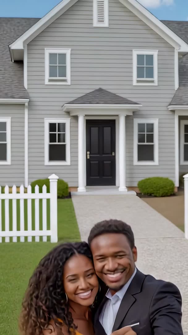 AI Generated Image. Couple standing in front of two-story suburban house presenting keys to camera while smiling and embracing. House featuring gray siding, white trim, black front door, small porch with columns, picket fence and manicured lawn. Framing vertical video orientation for mobile-first platforms and portrait storytelling. Foreground focusing on couple with house exterior creating emotional connection and aspirational lifestyle mood. Serving well for real estate closing announcement, realtor social posts, mortgage lender ads, homebuying blog posts, moving day vlogs, insurance campaigns, welcome home greetings, property listing teasers and lifestyle advertising.