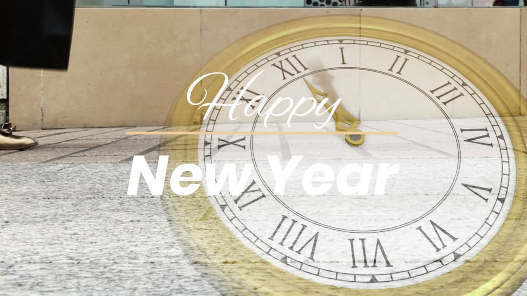 Digital composite shows 'Happy New Year' text and a classic clock overlay on a timelapse of people walking in a city street. Effective for New Year marketing campaigns, enhancing festive web applications, and greeting cards.