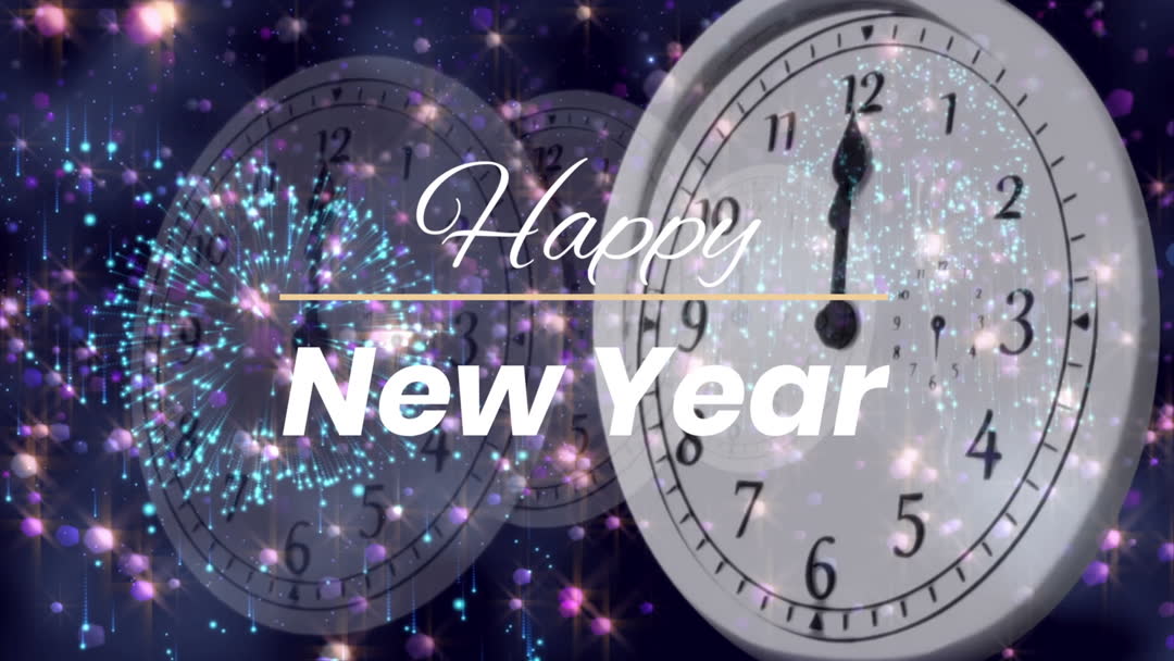 Vibrant design captures essence of New Year's celebration with words 'Happy New Year' overlaid on backdrop of glittering fireworks and clocks nearing midnight. Perfect for greeting cards, New Year's party invitations, or social media posts celebrating the arrival of the new year.