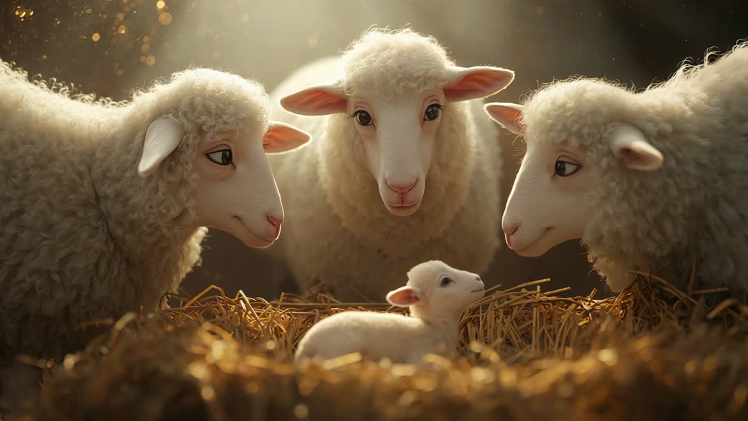 AI Generated Video. An adorable newborn lamb surrounded by three adult sheep forms a heartwarming scene inside a charming rustic barn. Warm sunbeams illuminate the hay, highlighting gentle dust motes that dance in the air around the animals. Perfect for scenes of farm life or tender portrayals of innocence and affection, useful in materials celebrating rural living or emphasizing a peaceful working farm visual setup.